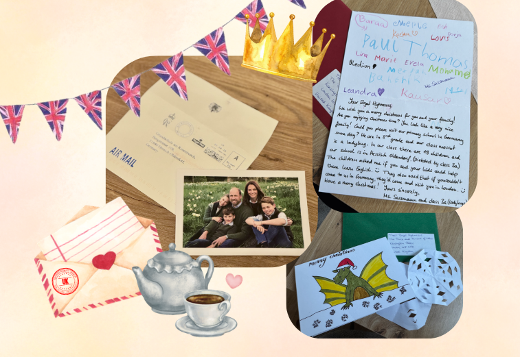 Im November 2025 ging ein Internet-Beitrag viral, in dem stand, dass die britische Königsfamilie im Kensington Palace alle Weihnachtskarten die sie erreichten, beantworten würden – da war die Idee geboren. Im Englischunterricht schrieben die Drachen-Klasse (3d) und die Marienkäfer-Klasse (3a) jeweils einen Weihnachtsbrief an die britische Königsfamilie. Sie stellten Fragen über das Leben im Palast, wünschten frohe Weihnachten, ein schönes, neues Jahr und schlugen vor, uns mal in Hessisch Oldendorf zu besuchen. Über Monate warteten die Kinder auf eine Antwort…
